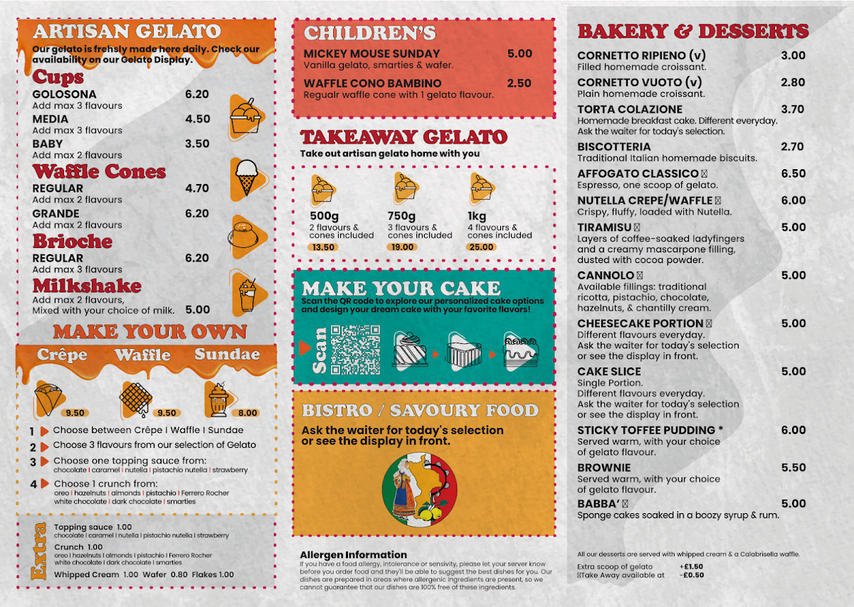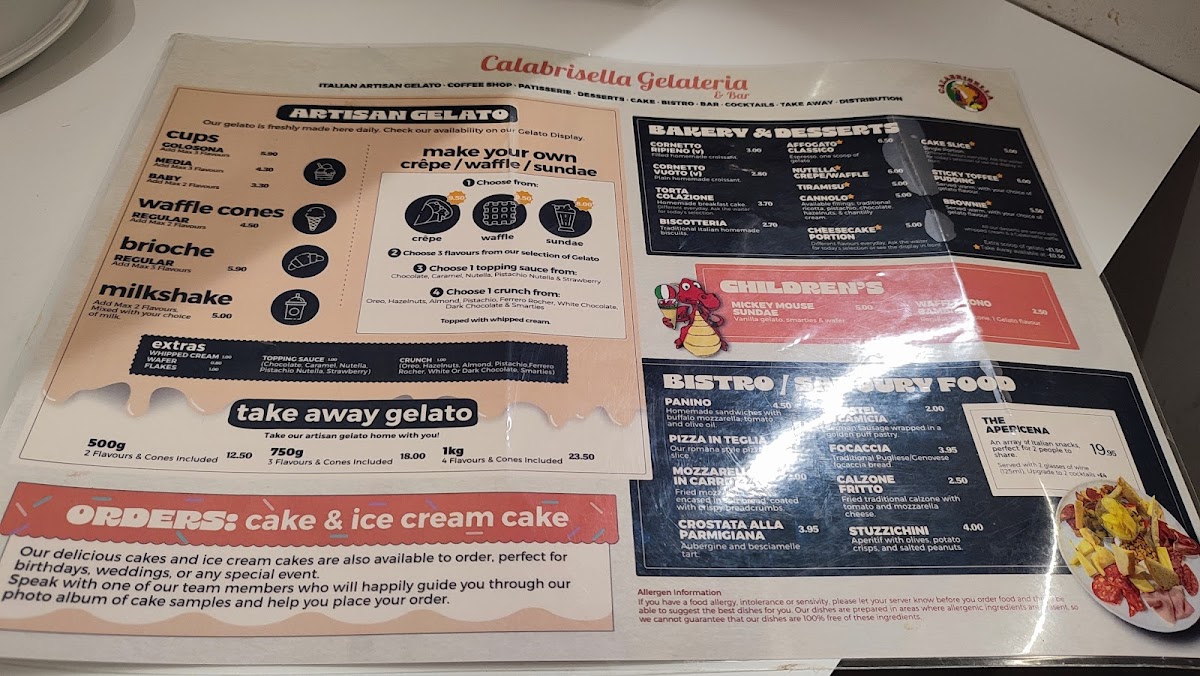 Calabrisella Gelateria offers a delightful selection of traditional Italian treats that are perfect for satisfying any sweet tooth. Their artisan gelato comes in various sizes, including Golosa and Media, with prices catering to both small and large appetites. For the younger crowd, the Mickey Mouse Sundae and Waffle Cono Bambino offer playful, kid-friendly options. The bakery and dessert section is equally tempting, featuring Cornetto Ripieno (v) and Cornetto Vuoto (v) for those seeking a pastry delight, while the indulgent Torta Colazione Biscotteria and refreshing Affogato Classico provide the perfect end to any meal. For those feeling creative, the Make Your Own section invites customers to build their own Crêpe, Waffle, or Sundae. If you're in the mood to enjoy some gelato at home, take advantage of their takeaway gelato options, available in 500g, 750g, or 1kg sizes. Overall, Calabrisella Gelateria serves up a menu full of delicious, customizable treats that ensure there's something for everyone to enjoy.